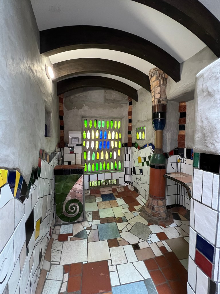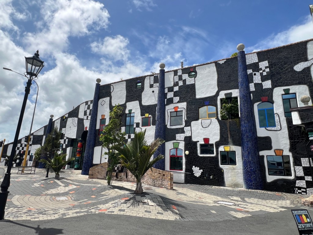 In Whangarei, einem hübschen Städtchen mit riesigem Verkehrschaos – zumindest der Parkplatz vor dem Einkaufscenter ist wohl aufgrund der anstehenden Vorweihnachtseinkäufe zur absoluten Kampfzone mutiert – gönnen wir uns eine leckere Portion Fish & Chips und bewundern das schöne Hundertwasser-Haus, welches wir an dieser Ecke der Erde nun wirklich nicht erwartet hätten. Da Friedensreich Hundertwasser aber anscheinend einen grossen Teil seines Lebens im Norden Neuseelands verbracht hatte, ist überall mal wieder deutlich seine Handschrift erkennbar. Etwas weiter nördlich in Kawakawa, seinem damaligen Wohnort, steht denn auch die wohl meistbesuchte Toilette Neuseelands, ebenfalls eines seiner Werke. Die Zahl der fotografierenden Besucher übersteigt dann aber jene, die tatsächlich dort ihr Geschäft verrichten, wohl deutlich 😉
