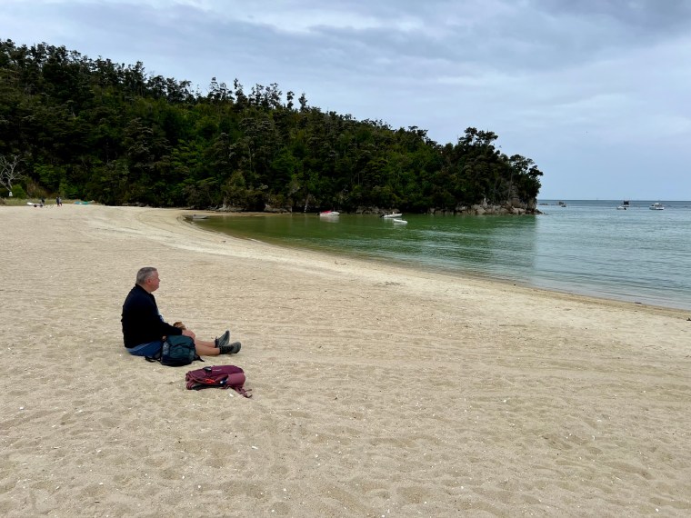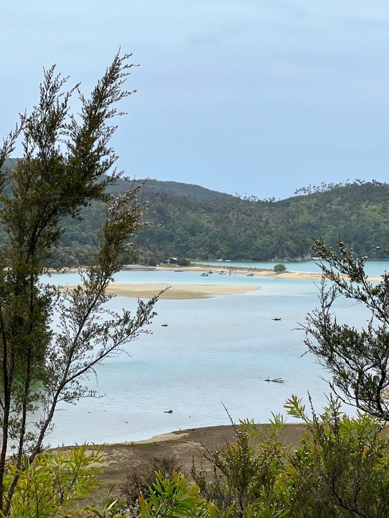 Am Tag darauf ist wandern angesagt. Die Strecke soll mehrheitlich flach und deshalb trotz der angegebenen 3-4 Stunden Wanderzeit eigentlich auch mit Yvo‘s Bronchitis machbar sein. Ein Boot bringt uns der spektakulären Küste des Abel Tasman Nationalparks entlang Richtung Norden, wir erspähen sogar ein paar Seehunde, und in einer der kleinen Buchten starten wir dann die Wanderung auf dem Abel Tasman Coast Track Richtung Süden. Und natürlich geht‘s erstmal bergauf… Durch wilde Wälder, die immer mal wieder den Blick auf die Küstenlinie freigeben, erreichen wir nach zwei Stunden unseren Picknickplatz am Meer – herrlich! Das Pech ist nur, dass wir bei Ebbe jetzt einen ziemlich kurzen Weg hätten, um die Bucht zu erreichen, wo uns unser Boot wieder abholt. Ja hätten… Es ist nämlich Flut… Die Option, ein Kajak zu entern und damit rüber zu fahren, verwerfen wir wieder. Bleibt nur noch die Option, die ganzen Meeresarme zu umgehen und haben mindestens eine Stunde Zusatzweg, munter rauf und runter… Also munter ist Yvo inzwischen nicht mehr, seine Lungenkapazität ist dann doch ziemlich eingeschränkt und so kraxeln wir ganz langsam die Wege hoch, ich glaube, wenn wir noch langsamer gegangen wären, wären wir zur Seite gekippt. Interessant ist, dass wir das Ziel dennoch nach dreienhalb Stunden, und somit immer noch absolut innerhalb der angegeben Zeit erreichen. Um 4 Stunden zu benötigen, müsste man den Weg dann wohl auf allen vieren zurücklegen 😉 Fazit ist, der Track ist wunderschön, bei sonnigem Wetter wären die Farben sicher noch umwerfender gewesen, temperaturmässig kam uns der bedeckte Himmel aber entgegen und während der einstündigen Wartezeit, bis uns das Boot wieder abholt, öffnen sich mal wieder die Wolken, aber die Regenjacke gehört ja inzwischen zum Marschbefehl. Wir sind definitiv in Neuseeland angekommen und immer auf alles gefasst 😊 Und Yvo kriegt jetzt definitiv eine Ruhepause, um sich endlich mal auszukurieren.