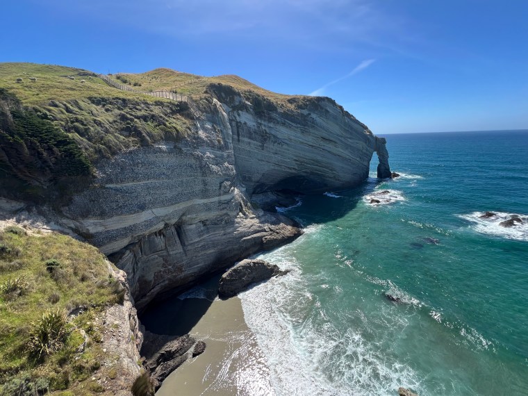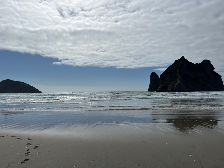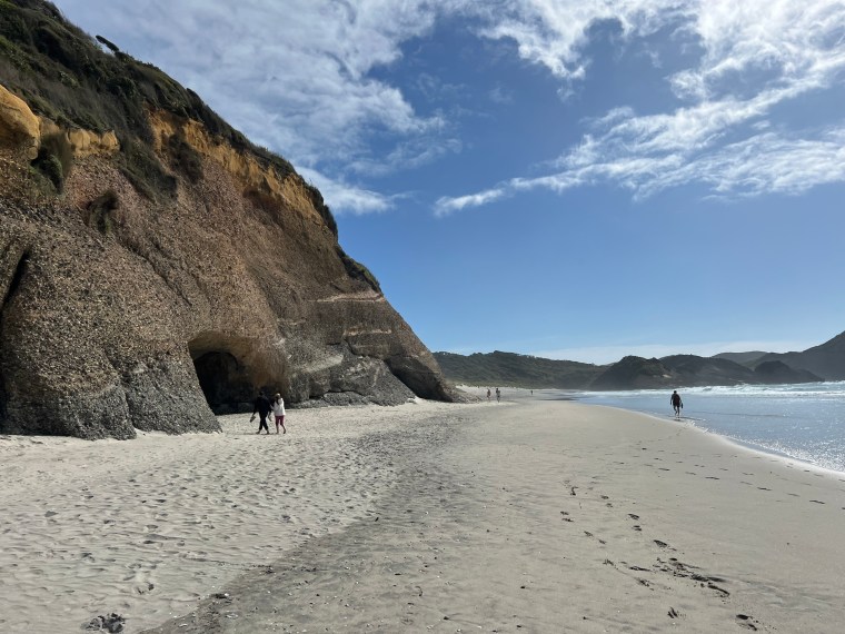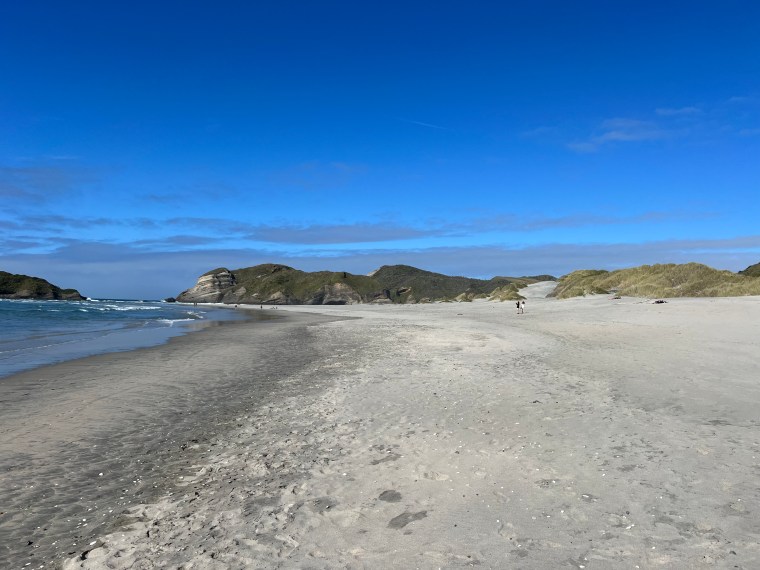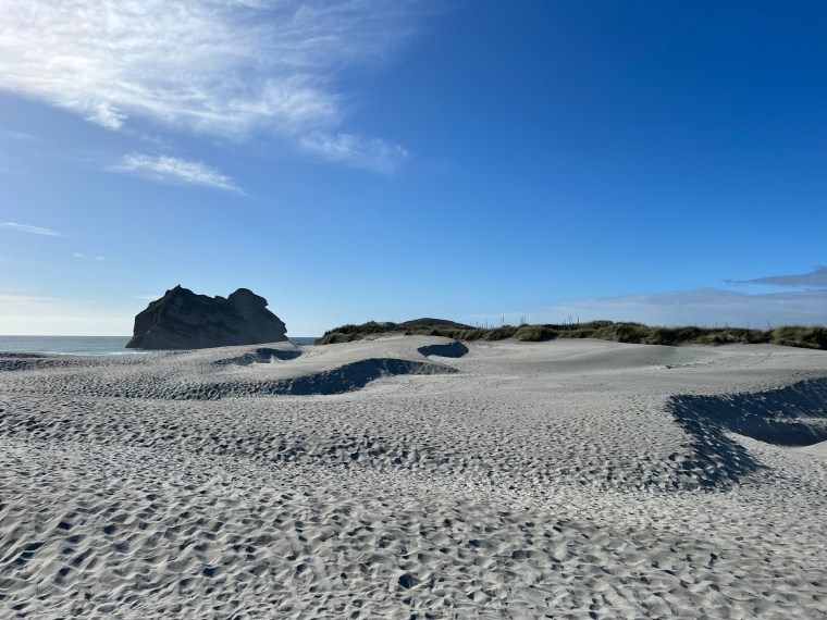 Am nächsten Morgen nehmen wir es gemütlich und beglücken zumindest einige Teile unserer Familie mit unerwarteten Videoanrufen. Die freuen sich richtig, uns wieder mal zu sehen und zu hören 😉 Und wir freuen uns natürlich auch 😍 Die Weiterfahrt zur Golden Bay ist mit 100 km nicht allzu lang, aber wie immer sehr kurvenreich und eng, auch wenn wir uns mehrheitlich auf irgendwelchen State Highways bewegen. Yvo’s (und ehrlich gesagt auch meinen) Nerven zuliebe lasse ich ihn fahren, da er inzwischen die Autobreite „von der falschen Seite“ vermutlich etwas besser im Griff hat und ich seine Nerven nicht in jeder Kurve unnötig strapazieren will. Ich habe mich ja inzwischen einigermassen an den Nervenkitzel auf dem Beifahrersitz gewöhnt und die vordere linke Autoecke ist zum Glück nach wie vor dort, wo sie hingehört. Unser Ziel, die Golden Bay, besucht anscheinend wirklich nur ein kleiner Teil der Touristen, es ist auch ein Abstecher, den man danach wieder auf der gleichen Strecke zurückfahren muss, aber was für eine fantastische Ecke wir da gefunden haben… Auf Empfehlung besuchen wir am späteren Nachmittag den Wharariki Beach, der nicht mal in allen Reiseführern aufgeführt ist. Was für eine Schande, wenn wir den verpasst hätten. Der Sand ist zwar dunkler, aber noch feiner als auf den Malediven und die Landschaft ist einfach einzigartig. Zum Baden müsste man aber schon von der abgehärteten Sorte sein, was wir definitiv nicht sind. Bezüglich Einzigartigkeit lasse ich einfach die Bilder sprechen. Was vielleicht noch zu sagen ist – Yvo musste auch an seinem versprochenen „Ruhetag“ wieder 12‘000 Schritte machen, was aber angesichts der fantastischen Location zur Nebensache verkam…