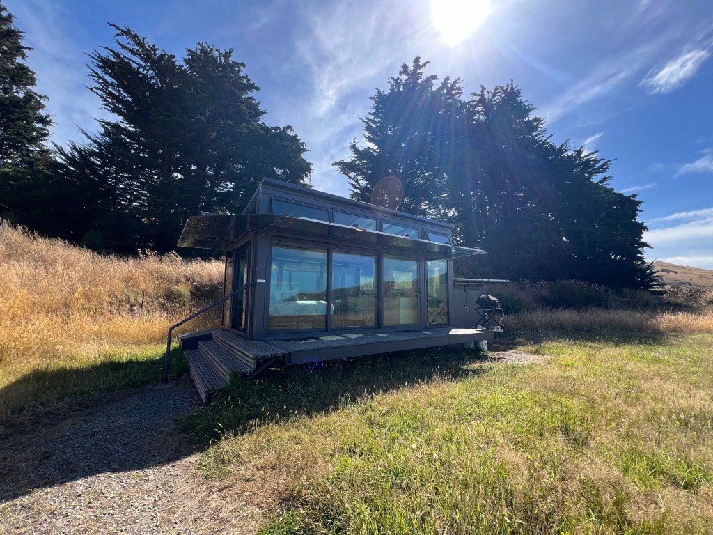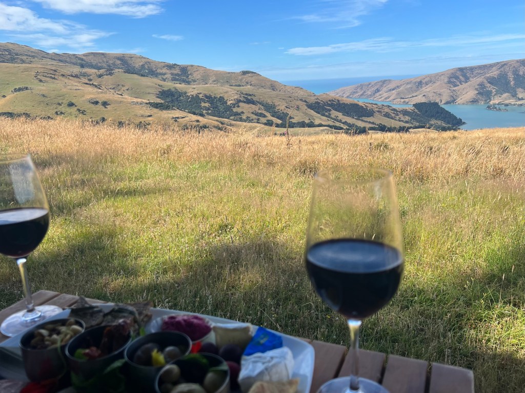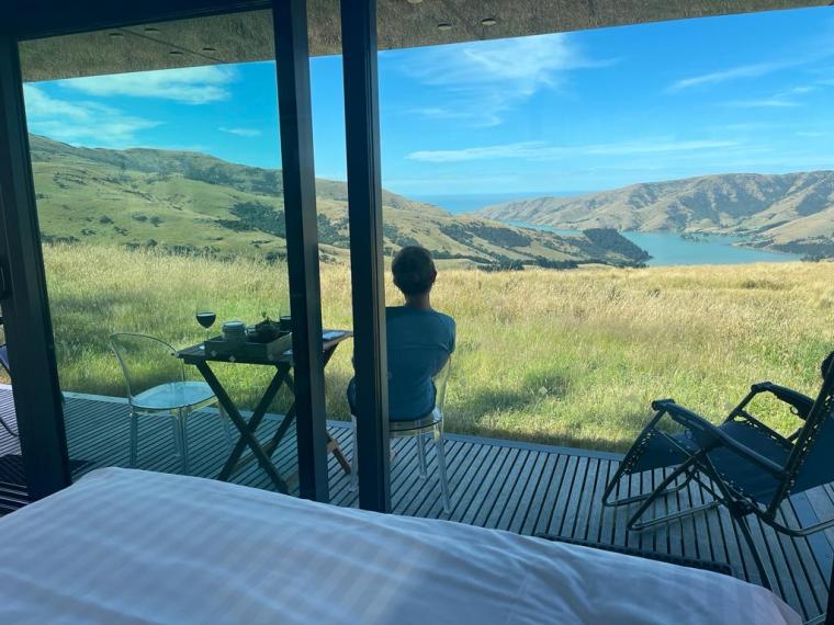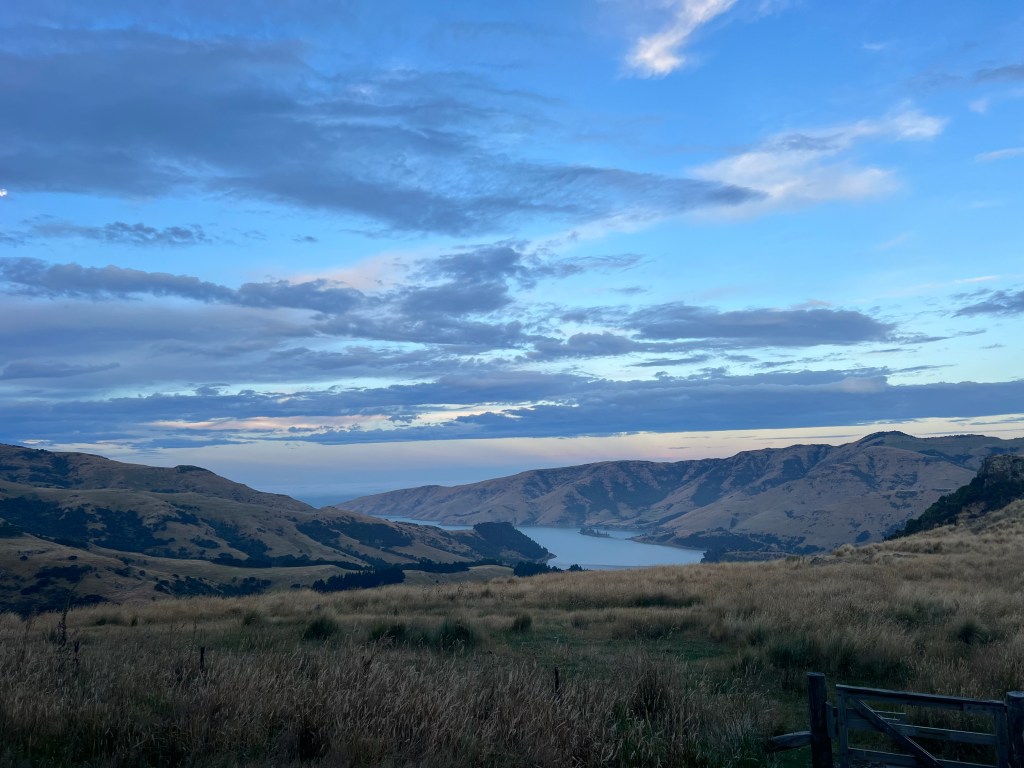 Für den heutigen Abend haben wir eine Übernachtung in einem PurePod gebucht. Das ist eigentlich ein Glashaus „in the middle of nowhere“. Wir wussten auch erst mit Erhalt der Reiseunterlagen, wo sich diese Unterkunft genau befindet und haben dazu eine genaue Wegbeschreibung erhalten. Erstmal führt uns die unglaublich kurvige Strasse ab Christchurch auf die Banks Pensinsula, wo sie immer schmaler wird und sich in engen Kurven über die Hügel windet. Und spätestens da bin ich froh, dass Yvo fährt, und ich nicht am letzten Tag noch meinen Ruf als einigermassen gute Autofahrerin riskiere und doch noch irgendwo eine Ecke des Autos liegen lasse… Yvo macht das natürlich souverän, auch wenn die Strasse aufgrund ihrer Holprigkeit und Kurven definitiv nichts für schwache Mägen ist – haben wir zum Glück nicht und staunen ab denen, die diesen Weg sogar mit Schiffen und Jet-Skis (auf Anhängern natürlich) bewältigen – viel Glück! Wir finden auch das beschriebene „Farm Gate“ und der Code des Vorhängeschlosses zum Parkplatz lässt sich problemlos öffnen – wir sind also am richtigen Ort. Von da geht es nun – nur mit dem Nötigsten bepackt – über Schafweiden zu unserer Unterkunft. Der Weg ist ziemlich versch***en und wir laufen deshalb im Slalom, um nicht grad in die grössten Haufen zu treten. Die vielen Disteln machen es nicht einfacher, aber immerhin ist der Weg gut beschildert, sonst hätten wir uns vermutlich hoffnungslos im hohen Gras verirrt. Und dann erreichen wir unseren PurePod und sind überwältigt. Zum einen ist die Aussicht genial, zum anderen ist der PurePod mit allem ausgestattet was man sich wünscht. Eigentlich ist es ein Glashaus (sogar der Boden ist aus Glas), gibt einem das Gefühl von Camping am abgelegensten aber wahnsinnig schönen Flecken Erde, irgendwo auf dem Land einer Schaffarm, ist aber mit Dusche, WC und unglaublich bequemem Bett vom feinsten ausgestattet. Im Kühlschrank wartet denn auch schon ein kaltes Plättli, die Zutaten für einen feinen BBQ-Znacht und auch ein leckeres Frühstück. Nur den Wein mussten wir selbst mitbringen – was wir natürlich auch gemacht haben. Eigentlich wurde uns auch ein Ort ohne jeglichen Handyempfang angekündigt, aber die Entwicklung macht auch hier keinen Halt und wir haben wider Erwarten ganze drei Striche beim Empfang. Irgendwie bin ich fast ein bisschen enttäuscht darüber und stelle deshalb mein Handy einfach mal auf Flugmodus – adieu Welt! Und dann geniessen wir es einfach. Die herrliche Aussicht, das BBQ-Abendessen draussen, die fantastische Abendstimmung, den total erholsamen Schlaf und das geweckt werden durch einen wunderbaren Sonnenaufgang um 06:15 Uhr. Einzig die Insekten machen einen solchen Lärm, man wähnt sich fast an einem Formel-1-Rennen, und hin und wieder mäht irgendwo ein Schaf. Und sonst ist es einfach totenstill. Herrlich! Nach dem Sonnenaufgang ziehen dann auch erst Mal ein paar Regenwolken auf, aber wir haben keine Eile und geniessen noch unseren PurePod und ein ausgiebiges Frühstück mit Burrito vom Grill, Müesli und selbstgebackenem Brot. Ist wohl auch das erste Mal, dass Grillmeister Yvo einen Zmorge grilliert… Kann er auch 👌 Nachdem sich die Wolken ausgeweint haben, wandern wir bei sonnigem Wetter wieder zurück zum Parkplatz. Und Yvo der schlaue Fuchs (alternativ: faule Fuchs? 😉) findet dabei sogar noch die Abkürzung, die uns auf direktem Weg und ohne Disteln, dafür etwas steiler zurück zum Auto führt.