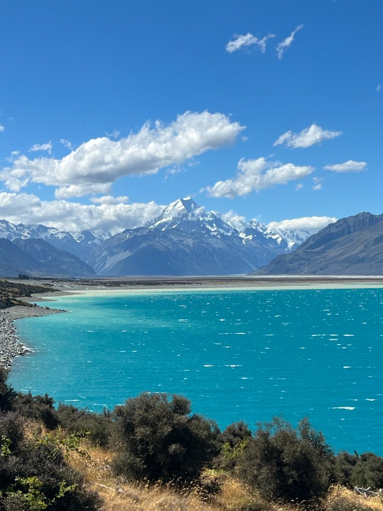 Die Krux bei dem Wetter ist einfach, dass man nie so genau weiss, was man bekommt. Der Blick aus dem Fenster ist zumindest schon mal zuverlässiger als jener in die Wetter App. Die Neuseeländer verlassen sich übrigens am ehesten auf die Vorhersage einer norwegischen Wetterstation, da diese mit Hilfe von Satelliten eine zuverlässigere Vorhersage hinkriegt als ihre lokalen „Wetterschmöcker“ 😉 Machen wir also auch. Am Samstag wollen wir nach Mt Cook Village und von dort eine ca. dreistündige Wanderung machen. Bis zum Mittag ist in den Bergen noch Regen angesagt, ab dem frühen Nachmittag soll es besser werden. Genügend Zeit also, um gemütlich zu frühstücken und dann bei schönstem Wetter und strahlendem Sonnenschein in Twizel loszufahren und unsere Wanderwädli mal wieder zu beschäftigen. Die Fahrt von Twizel nach Mt Cook gehört definitiv zu den schönsten Strecken, die wir hier gefahren sind. Wieviele solche Strecken haben wir schon in unseren Top 3? So um die zehn sicher 😂 Also sorry für die, die aufmerksam mitgezählt haben, aber wir können uns nicht auf drei beschränken… Die Strasse führt auf der linken Seite dem Lake Pukaki entlang und das türkisblaue Wasser leuchtet in der Umgebung der gelben Felder und Hügel noch viel intensiver. Yvo meint sogar, es sei noch mehr türkis als auf den Malediven. Das Wetter bleibt lange wunderbar, zumindest solange wir links oder rechts aus dem Autofenster schauen, beim Blick nach vorne schaut es etwas weniger vielversprechend aus und wir sind da eher so bei „50 shades of grey“… In Mt Cook angekommen regnet es dann auch ab und zu ziemlich heftig, mitunter von stürmischen Windböen begleitet. Wir nutzen die Zeit, uns das Museum anzuschauen, das einen interessanten Einblick in die Geschichte des Bergsteigens und insbesondere in die Gegend um den Mt Cook bietet. Sir Edmund Hillary hat den Mt Cook übrigens als Übungsberg für seine Erstbesteigung des Mt Everest genutzt, deshalb sind auch die ganzen Visitor Centers in der Region nach ihm (Hillary) benannt. Und ja, in genau diesem Visitor Center erfahren wir dann auch, dass der Hooker Valley Track, den wir später noch bewandern wollen, wegen zu viel Regen bis mindestens morgen früh gesperrt ist. Hätten wir eine Sammelkarte für gesperrte Wanderwege und abgesagte Aktivitäten, wir wären beim Punkte sammeln sicher auch in den Top 3 😉 Aber was soll’s, wir sind ja mittlerweile tiefenentspannt und da es immer noch regnet, gönnen wir uns zuerst sowieso mal einen Kaffee und lassen uns auch von dem ebenfalls extrem gemütlichen (man könnte auch sagen langsamen, geschwätzigen, aber auch sehr sympathischen) Bergler, der die Kasse bedient und es auch bei etwa fünf Wartenden schafft, einen längeren Stau zu verursachen, nicht aus der Ruhe bringen. Was soll’s, wir müssen sowieso warten, bis es zumindest ein bisschen trockener wird… Was dann passiert, hätten wir uns ja denken können… Der Regen hört auf und wie ein Tatzelwurm fahren die ganzen Touristen aus aller Welt zum Parkplatz, wo der Wanderweg beginnt. Der erste Kilometer des Tracks ist noch offen, das heisst, alle Wanderlustigen, die sich sonst während des ganzen Tages auf dem gesamten Track verteilen, sind nun in den gleichen 15 Minuten auf diesem Kilometer unterwegs. Vom Stechschritt zum Humpelgang findest du alles, es wird geschupst und überholt und wir mittendrin. Und gleichzeitig bläst uns der extrem stürmische Wind fast aus den Wanderschuhen. Was vielleicht wieder den Stechschritt der einen erklären mag – möglichst schnell den Aussichtspunkt abhaken und zurück zum Auto… „Das Wandern ist des Müller‘s Lust“ geht definitiv anders. Dennoch kämpfen wir uns bis zum Aussichtspunkt beim „Mueller Lake“ durch (wenn wir schon beim Namen sind), aber es ist uns echt zu überlaufen und wir sind froh, als wir zurück beim Parkplatz sind, wo wir erst unser Auto suchen müssen, und wir überlegen uns ernsthaft, ob wir uns den Abstecher zum Tasman Glacier Viewpoint auch noch „antun“ sollen. Aber nach Yvo’s letztem Blogbeitrag könnt ihr es euch ja denken 😉 Wenn wir schon mal da sind… Erstaunlicherweise hat es dort bei weitem nicht so viele Autos, also auch weniger Leute. Wir gehen erst zu den Blue Lakes – obwohl es sich uns nicht erschliesst, wie die zu ihrem Namen kommen – und erklimmen dann voll motiviert auch noch die ganzen Stufen bis zum Aussichtspunkt auf den Gletscher. Da uns diese Aussicht bei den Gletschern auf der anderen Seite der Bergkette ja mässig beeindruckt hat, ist die Erwartung nicht allzu hoch. Aber siehe da, eine echt schöne Aussicht über den Gletschersee, in dem sich auch noch ein paar abgebrochene Eisschollen tummeln, auf den doch noch recht eindrücklichen Gletscher – die vergossenen Schweissperlen haben sich also definitiv gelohnt und wir erfreuen uns an der herrlichen Aussicht! Gleichzeitig staunen wir ab der Influencer-Generation (wir nennen wie jetzt einfach mal so), die sogar das Stativ – und nicht ein kleines – ein richtig grosses – für die Kamera auf den Berg mitschleppt, um das perfekte Selfie mit Selbstauslöser und von hinten und so hinzukriegen… Die Bilder sind bei dem Hintergrund aber sicher toll geworden, das müssen wir dann neidlos zugeben. Muss ich mir für die nächsten Ferien merken: Stativ in Yvo’s Rucksack packen! 😜 Könnten wir ja beim Wandern in der Schweiz schon mal üben – so als Training… Das Wetter ist inzwischen wunderbar und der Mt Cook zeigt sich – ganz wider Erwarten – in seiner ganzen Pracht. Wow, ist das schön! Und so legen wir auch auf der Rückfahrt den ein oder anderen Stopp ein, da insbesondere Yvo ja nicht während der ganzen Fahrt in den Rückspiegel schauen kann, wo sich die Bergwelt grad von ihrer schönsten Seite zeigt.