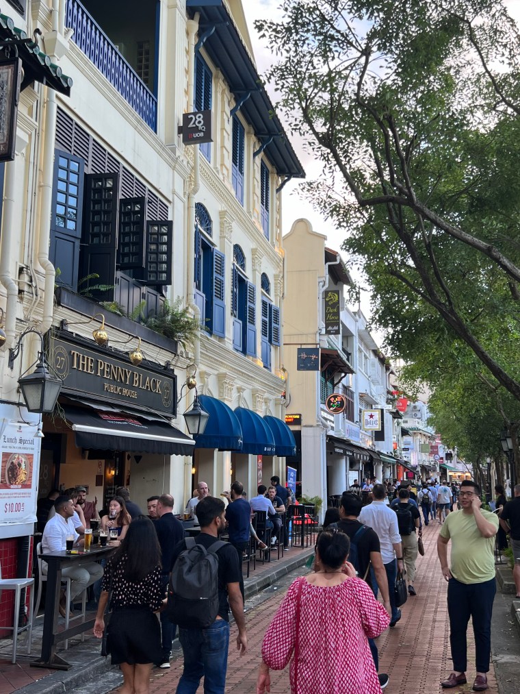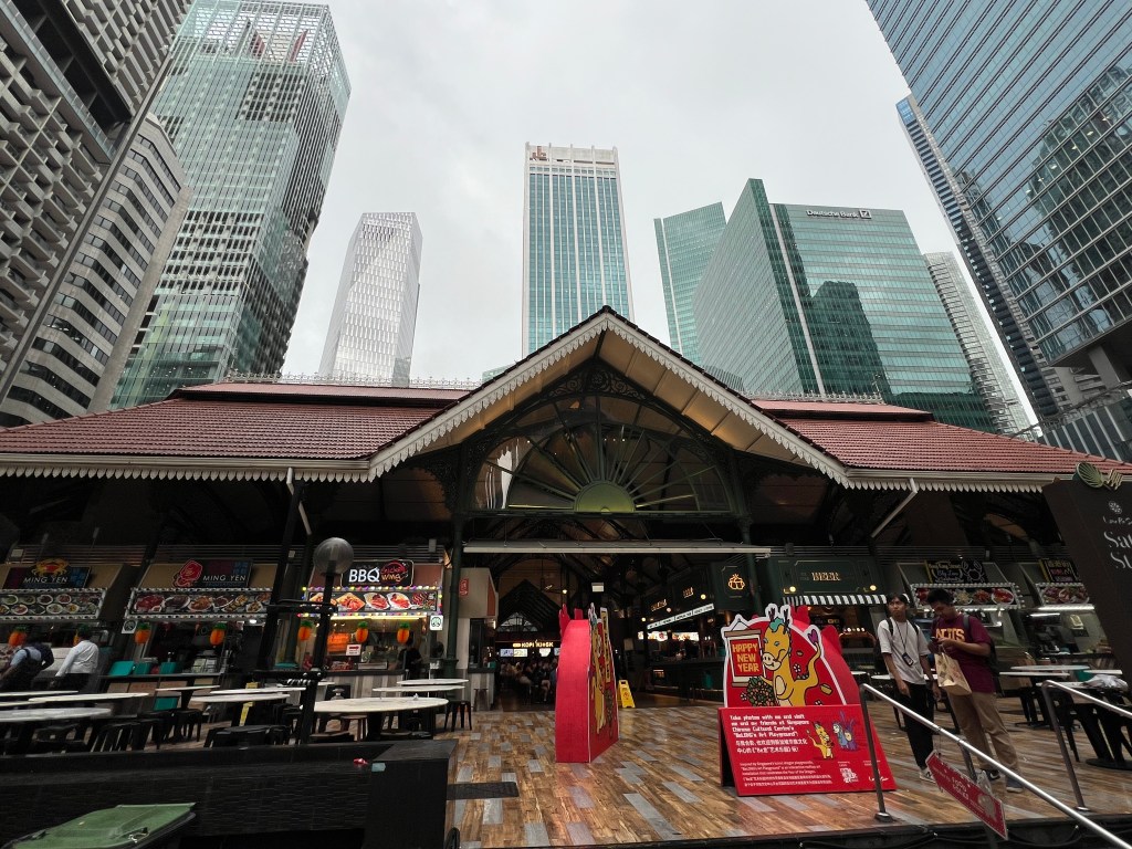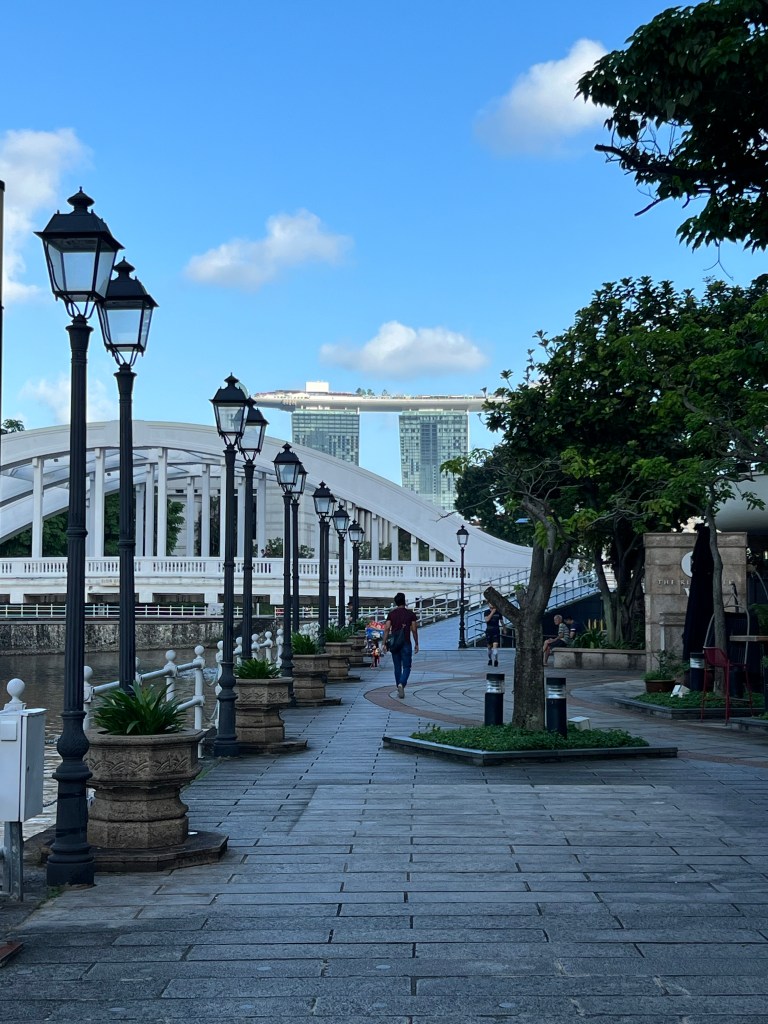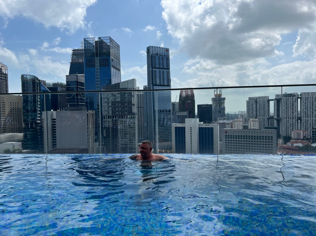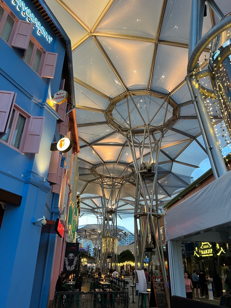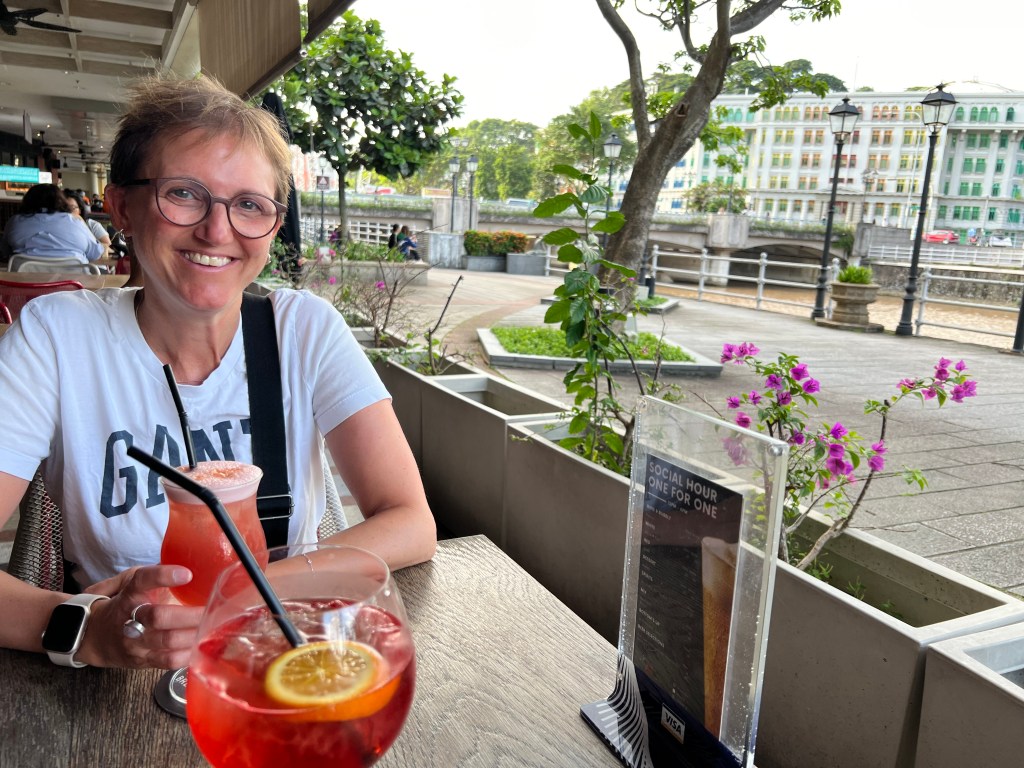 Die Stadt hatte ich ja schon beschrieben. Am Freitag Vormittag fahren wir nach Sentosa Island, eigentlich in der Absicht, Yvo noch ein bisschen Badeferien-Feeling zu gönnen. Naja, es gibt zwar eigentlich ganz schöne Strände hier, davor lagern aber unzählige Frachtschiffe und Supertanker und etwas was aussieht, wie eine Bohrinsel 🤔 Dazu gibt es Ölsperren und die Warnung vor Quallen… Und da zeigt sich jetzt vielleicht gerade, dass wir einfach verwöhnt sind. Zudem ist Sentosa Island in den letzten Jahren zum reinsten Vergnügungspark geworden (es gibt Universal Studios, Roller Coaster, Bungee Jumping, Zipline und alles was man eben so braucht, um sich zu vergnügen) und irgendwie will das Strandfeeling bei uns nicht so richtig aufkommen. Wir überlegen uns noch einen kurzen Moment, mit der Gondel zurückzufahren, hauptsächlich wegen der Aussicht, merken dann aber, dass diese gar nicht bis aufs Festland, sondern nur auf der Insel „gondelt“. Also Plan verworfen, wieder in die Monorail gestiegen und hopp, zurück in die Stadt, schnurstracks zum Hotel und ab in den Pool. Was wir da noch nicht wissen, es wird der erste Tag in Singapur seit Ende November, an dem es nicht regnet. Whoohoo… Deshalb gönnen wir uns nach der grössten Hitze und der Abkühlung im Pool einen Bummel zum Boat Quay und Clarke Quay, sicher eines der belebtesten Viertel hier. Es gibt Hunderte von Restaurants, schöne Spazierwege entlang des Flusses, aber auch Mallorca-Feeling, da dir bei jedem Restaurant – und das ist alle 3 Meter – die Speisekarte ca. 4cm vor die Nase gestreckt wird. Nein danke, wir haben (noch) keinen Hunger, nein danke, no thanks, merci nei, „oh Mann chömmer wieder gah?“ 😂 Wir finden einen ruhigeren Platz, wo wir uns einen Apero genehmigen und was trinkt man hier? Singapore Sling natürlich – Ehrensache! Also Yvo einen Campari Spritz, aber egal, Italien ist ja auch grad um die Ecke – quasi. Das Abendessen gehört definitiv nicht zu den Top 3, aber die quirlige Atmosphäre entschädigt uns dafür und wir entdecken auf dem Weg vom und zum Hotel zurück ein paar wirklich coole Quartiere, gefällt uns. Apropos Essen – gibt es hier reichlich! In unmittelbarer Nähe unseres Hotels gibt es einen asiatischen Food Court (wir befinden uns direkt bei Chinatown), wo es unzählige Essensstände gibt und es mittags und abends von Leuten, die sich da verpflegen, nur so wimmelt. Und man sieht genau, welches die Touristen sind. Die, die komplett überwältigt in der Mitte des Gewühls stehen, die Wege versperren und mit der Auswahl masslos überfordert sind. Ja, wir gehören auch zu denen 😉 Was es nicht einfacher macht, ist dass vieles mit asiatischen Schriftzeichen angeschrieben ist und wir wollen ja keine Kutteln essen (gibt es – haben wir gesehen…). Haben jetzt aber schon mehrmals da gegessen, war immer super lecker und kostet pro Person jeweils zwischen 5 und 8 Franken… Verglichen zum Essen im Touriviertel – much better! Aber das weiss man ja eigentlich…