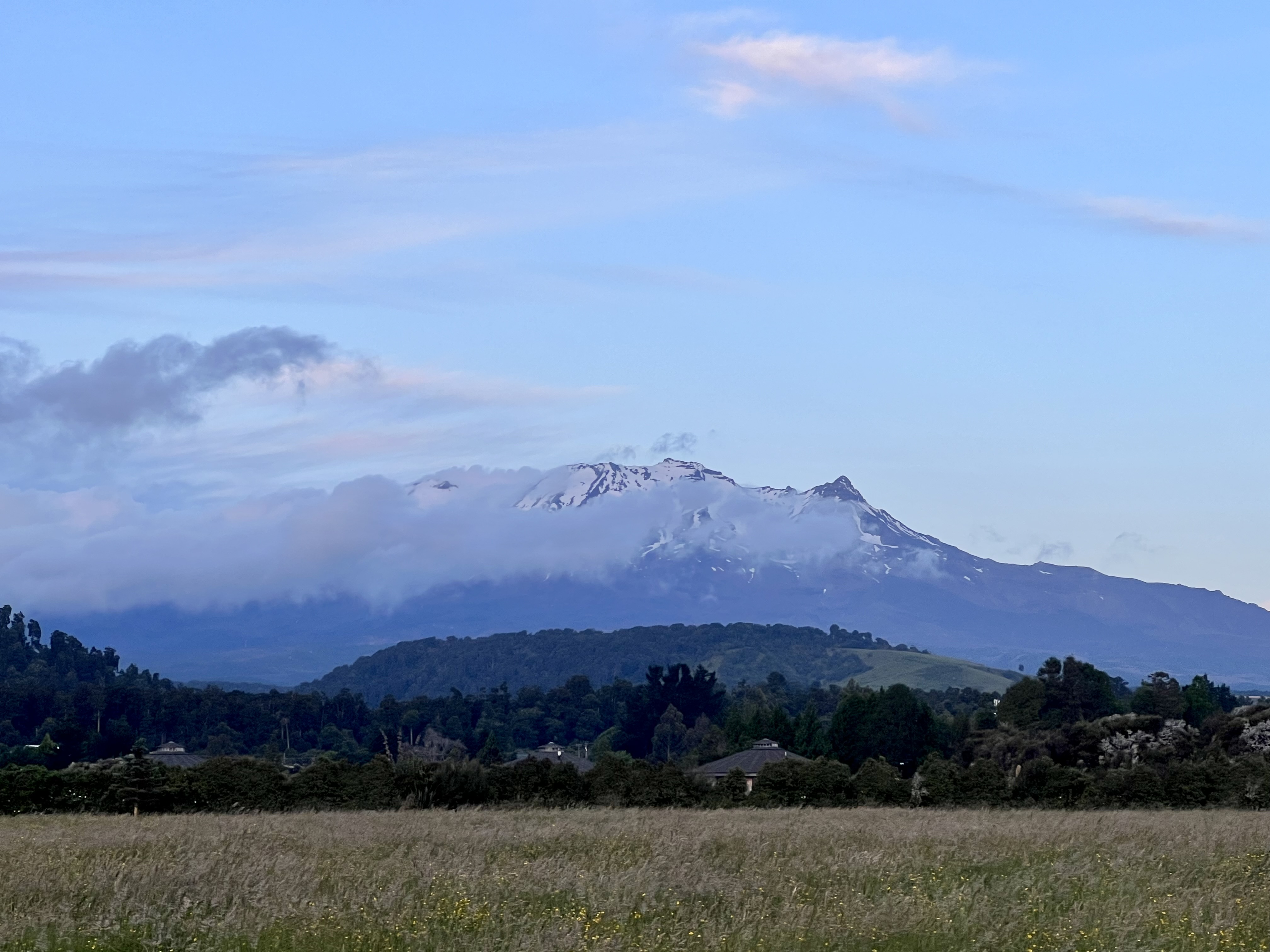 31. Dezember – 2. Januar: An unserem letzten Abend in der Tongariro-Region gönnen uns die Wolken tatsächlich noch ein paar kurze Blicke auf die Bergwelt, weshalb ich sogar zweimal vom Abendessen weglaufen muss, um dieses Ereignis auch für die Nachwelt fotografisch festzuhalten. 😂 Der Bock (Venison) auf unseren Tellern ist zwar geschmacklich gut, war aber wohl schon ein älteres Semester und erleidet während der kurzen Abwesenheiten keine grossen Qualitäts- resp. Zartheits-Einbussen…