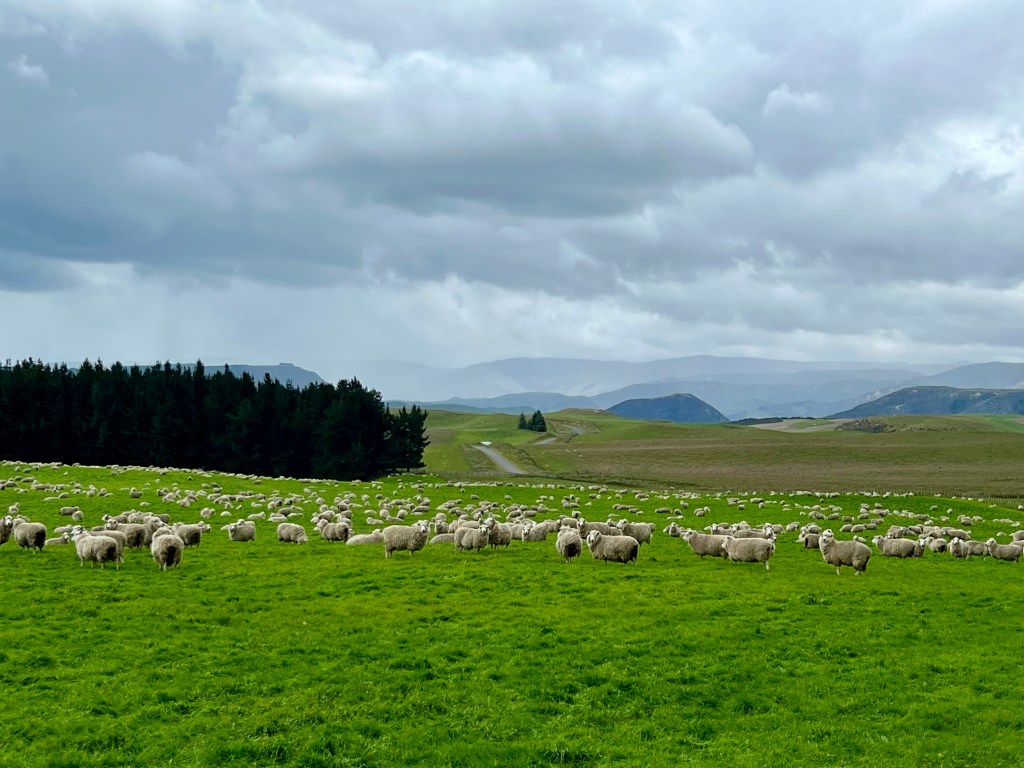 Am letzten Tag des Jahres fahren wir weiter Richtung Ostküste, der Sonne entgegen. Die Landschaft ist fantastisch, sehr grün, und endlich wird auch unsere Erwartung, was die Schafe betrifft, langsam erfüllt. Wo im Norden klar die Kühe und die Milchwirtschaft dominieren, befinden wir uns jetzt irgendwo in der Schnittmenge zwischen Kühen und Schafen. Friedlich grasend teilen sie sich die weiten Weiden, und wir sind sicher, die hellen Punkte werden auf der Fahrt Richtung Süden noch klar die Dominanz übernehmen.